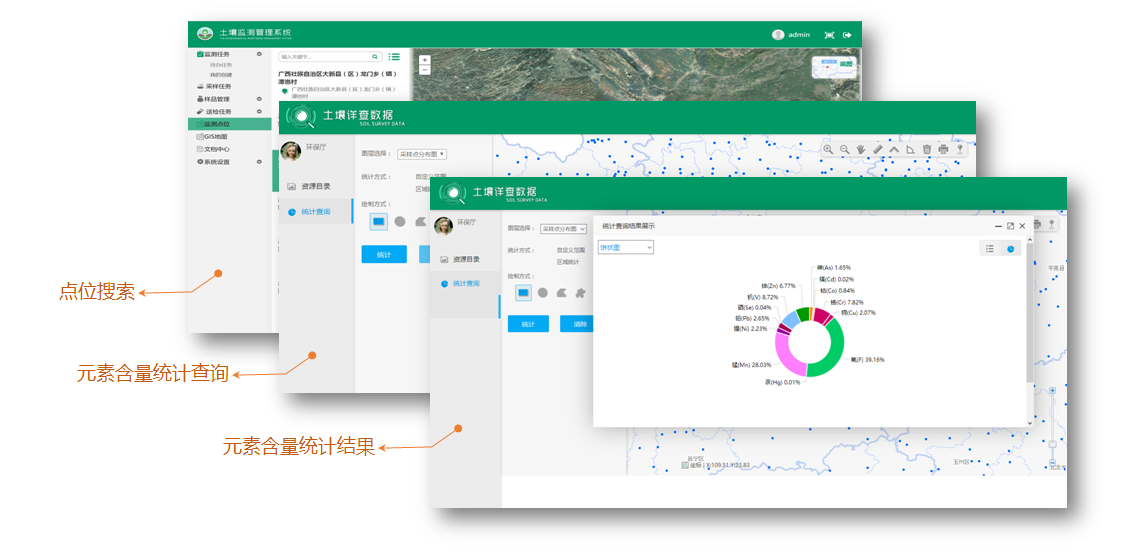 基于历史点位数据、土地利用数据、土壤类型数据、航拍影像、土壤采样数据、污染企业分布、成土母岩、 元素含量分析数据等数据,建立一套土壤数据查询分析系统,结合GIS技术提供数据的查询、检索、统计及分析等功能。